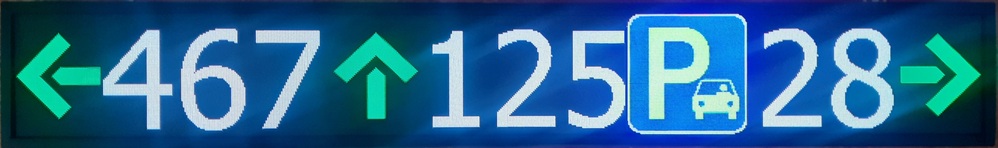 Данная технология дает возможность реализации широкого ассортимента табло с индикаторами от 1 до 4 разрядов и стрелками различных конфигураций и направлений для различных категорий мест (для маломобильных групп населения, для семей с детьми, для электромобилей, для мотоциклов и т.п.).